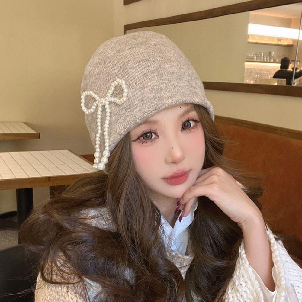 Ear Protector Pearl Bow Beanies Cap Casual Korean Wool Hat Stacking Knitted Bonnet Cap Daily