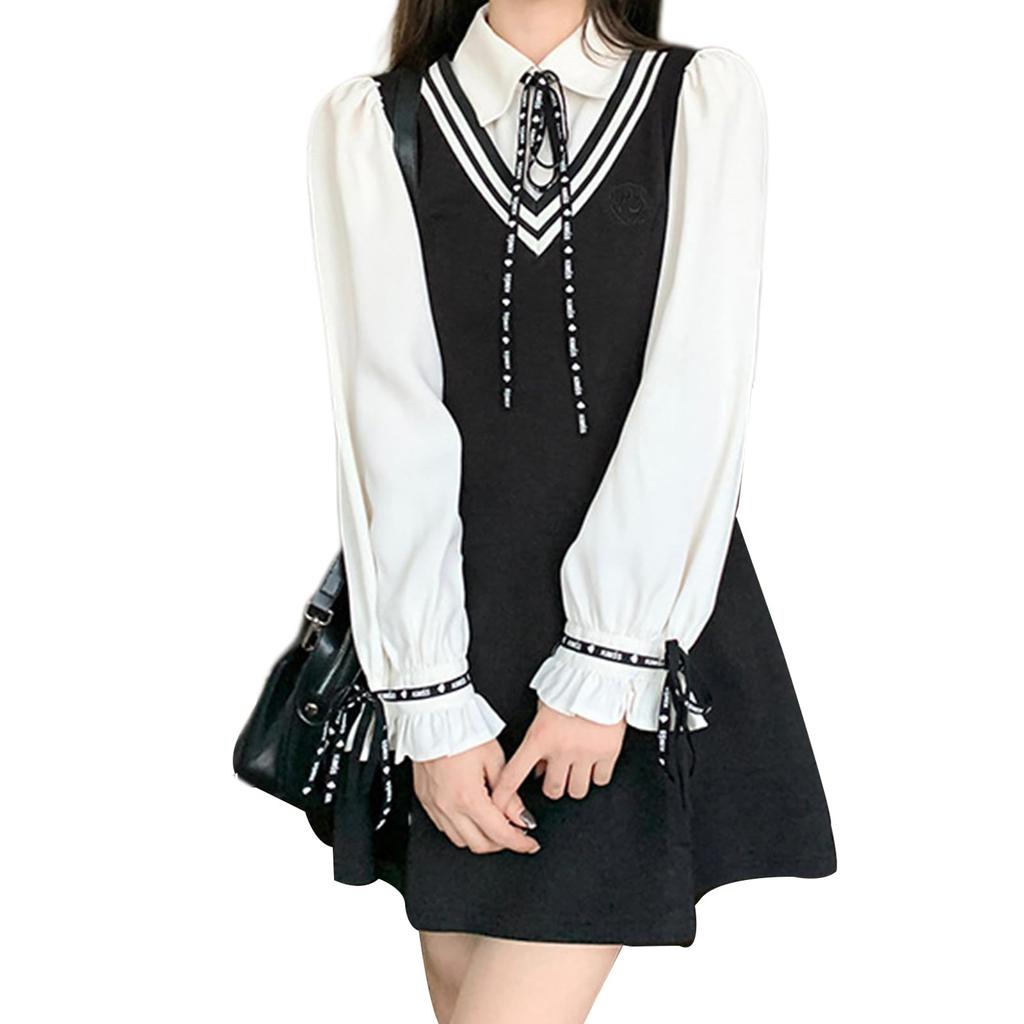 [Product Specifications] Black and white stitched dress with ribbon, student-like design, mass-produced and unconventional design, mini length, super cute! Available in M-2XL, short sleeves and long sleeves.