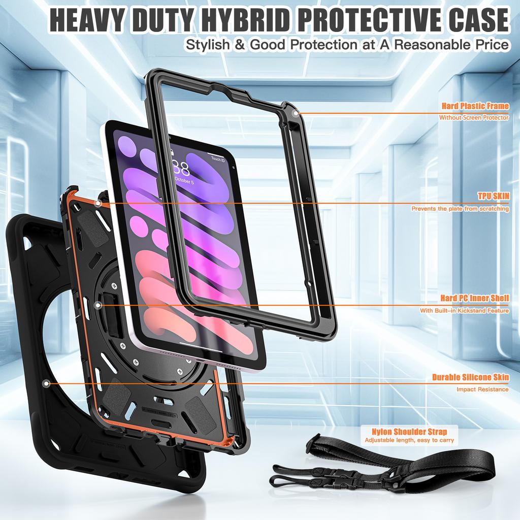 For iPad mini (2024)/(2021) Case with Shoulder Strap Kickstand PC + Silicone + TPU Tablet Cover