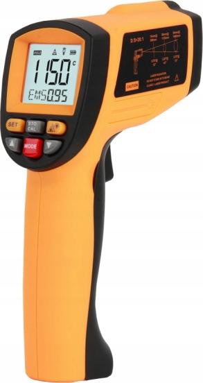 PROFESSIONAL BENETECH PYROMETER ORIGINAL BENETECH BRAND PRODUCT NON-CONTACT INFRARED THERMOMETER WITH LASER AIM AND EMISSIVITY ADJUSTMENT High-quality non-contact thermometer by Benetech with a temperature range from -30 to +1150 °C. The device is equipped with a laser aimer that allows precise aiming of the tested point. The device uses high-quality materials, and its ergonomic design improves the thermometer's comfort of use. The backlit display allows for operation in the dark. The pyrometer is equipped with an automatic shut-off function, saving battery life. The pyrometer has adjustable emissivity. Emissivity is the ability of a given material to reflect the infrared signal emitted by the pyrometer. This allows for more precise measurements. Additional functions and operating modes of the device: MAX - Maximum temperature measurement MIN - Minimum temperature measurement DIF - Temperature difference measurement compared to the previous measurement AVG - Average temperature measurement HAL - High temperature alarm (informs with a sound when the temperature reaches the set value) LAL - Low temperature alarm (informs with a sound when the temperature reaches the set value) STO - Storage of measurement results (allows to store 30 measurement results) EMS - Digital emissivity adjustment function in the range of 0.10 to 1.00 We are the direct and authorized distributor brands BENETECH and WINTACT in Poland. At the customer's request, we attach a calibration report from the manufacturer translated into English. We receive the document in electronic form a few days later. To avoid delays in order processing, we send the certificate within approximately 7 business days to the email address provided in the order or assigned to your account. The calibration certificate is a free, optional document and therefore is not included in this offer. APPLICATION OF THE DEVICE: AUTOMOTIVE AND MACHINERY INDUSTRY. CONSTRUCTION. REFRIGERATION INDUSTRY. FOOD INDUSTRY. GASTRONOMIC INDUSTRY. The pyrometer is not a medical device, is not intended to measure body temperature. The values it displays show surface temperature, which in the case of the skin is different from core body temperature. DEVICE FEATURES: High quality. Easy to use. Proven brand. Precise measurements. Ergonomic design. Backlit display. Laser pointer. Auto off function. Good value for money. TEMPERATURE RANGE TECHNICAL PARAMETERS: Measurement range: -30 to 1150 °C, Measurement accuracy: 0 to 1150°C ±1.5°C / -50 to 0 ± 3°C Resolution: 0.1°C (°F), Repeatability: 1% ± 1°C, Emissivity sensitivity:8-14 um Response time: 500 msec. (95% response), Emissivity range 0.10 to 1.00 Measurement distance ratio: 20:1, Power supply: 9 V alkaline or Ni-Cd battery, Operating time: without laser pointer up to 22h/12h with laser pointer, Weight: 270 g with battery, Standards: CE, FCC. Dimensions: 175 x 100 x 49 mm DISPLAY DESCRIPTION a. Measurement result, b. Measurement unit, c. Laser target icon, d. Display backlight icon, e. Battery level icon, f. Measurement in progress icon, g. Hold measurement result icon, h. Emissivity level, i. Data storage icon, j. Low temperature alarm, k. High temperature alarm. INCLUDED: Benetech GM1150 pyrometer, Convenient case for storage and transport, Original packaging, 9V battery, User manual in Polish! About the BENETECH brand BENETECH is a manufacturer of advanced measurement and control equipment. A specialized supplier of professional, digital measuring tools and other electronic devices. BENETECH POLAND is the authorized and direct distributor of this brand in Poland and Europe. In the brand catalog you will find, among others: pyrometers and thermal imaging cameras, anemometers (wind gauges), humidity meters and hygrometers, gas and air quality detectors and meters, sonometers (decibel meters) and luxmeters (light meters), laser rangefinders and tachometers, thermometers and manometers, thickness and vibration gauges (vibrometers), electrician's tools and cable detectors, electromagnetic radiation meter, home and industrial electronics devices. At the customer's request, we enclose calibration report from the manufacturer, translated into English. We receive the document electronically a few days later. To avoid delays in order processing, we send the calibration report within approximately 7 business days to the email address provided in the order or assigned to your account. The manufacturer's calibration report is a free, optional document and is therefore not included in this offer.