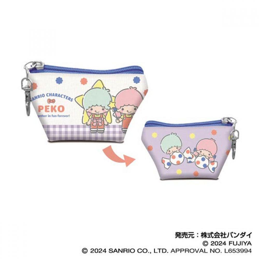 The Sanrio PEKO x Sanrio Characters: Earphone Pouch 05 Little Twin Stars is a collaboration product featuring Fujiy's mascot 'PEKO' and the popular characters 'Little Twin Stars (Kiki & Lala)'. It combines a cute design with practical functionality, allowing easy storage of earphones or small accessories. The front features illustrations of PEKO and the Little Twin Stars, accurately reproducing the actual product image.