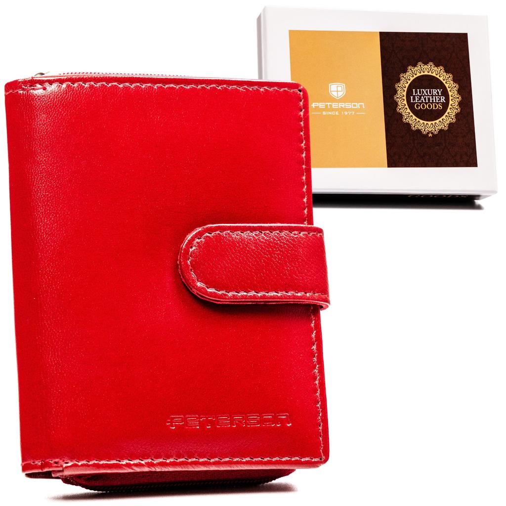 Peterson Women's Small Leather Wallet with RFID Clasp Small women's wallet made of natural leather RFID PETERSON #⃣Choose a Polish brand! | A product of a well-known and respected Polish brand with a long tradition #⃣ Highest quality leather | Made of natural leather, very durable and pleasant to the touch. By choosing a wallet made of this material, you can be sure that you are buying it for years.#⃣ A small accessory for women of all ages | A stylish small wallet with a snap closure. The timeless design, complemented by silver hardware, makes you feel fashionable and comfortable!#⃣ Small, handy wallet | This relatively small model is perfect for small purses. It won't take up much space in your purse, and you can easily keep it in your pocket.#⃣ Highest level of security| Equipped with RFID BLOCKING SYSTEM technology, which protects proximity cards, biometric documents, ID cards and public transport cards against unauthorized data reading. Parameters Manufacturer: PETERSON® Material: leather natural Height: 11 cm Width: 8.5 cm Depth: 2 cm Number of coin slots: 1 Number of banknote slots: 1 Number of card/document slots: 7 Orientation: vertical External fastening: snap fastener PACKED AS A GIFTBy purchasing this wallet, you get an elegantly packaged, complete gift, ready to give to a loved one.With the wallet, you always receive: an elegant box (a beautiful decorative branded box visible at the auction) a set of branded tags Dimensions of the package: 12.5 x 10 x 3 cm. A number of compartments for your cards A small wallet that offers a lot! The interior is extensive, equipped with a number of practical compartments and pockets that make it easy to organize your cards, documents and money.The wallet contains: 7 compartments dedicated to cards, business cards or documents of standard format; 1 coin pocket with a zipper. This pocket is located on the outside of the wallet.You can store banknotes in: 1⃣ open compartment. It's very spacious, you can fit a lot of paper money in it; Highest level securityWallet equipped with a special lining with RFID BLOCKING SYSTEM (Radio-Frequency IDentification), which protects proximity cards, biometric documents, ID cards and public transport cards against unauthorized data reading. The technology prevents data from being read using special readers used for data theft.RFID anti-theft protection for the following documents: Biometric passports All contactless payment cards such as Paypass, Paywave, Wave and Blink New student ID cards Public transport cards Building access cards operating at a frequency of 13.56 MHz MIFARE, HID iClass, DESFire cards Peterson® - trust a renowned brand!Peterson® brand products are extremely popular. Each product is designed in line with current trends, reflecting an original and timeless style. The richness of colors and patterns, as well as high quality of workmanship, are the features that characterize the brand.Feel fashionable and comfortable in every situation, complement your wardrobe with fantastic accessories at very affordable prices!