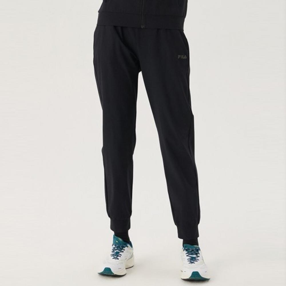 FILA Cooling Stretch Jogger Pants are women's training bottoms made from cooling material and feature stretch functionality. The fabric combines the advantages of woven and knit materials, providing excellent stretch and breathability. The jogger style offers a comfortable fit and length, and the color is black.