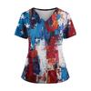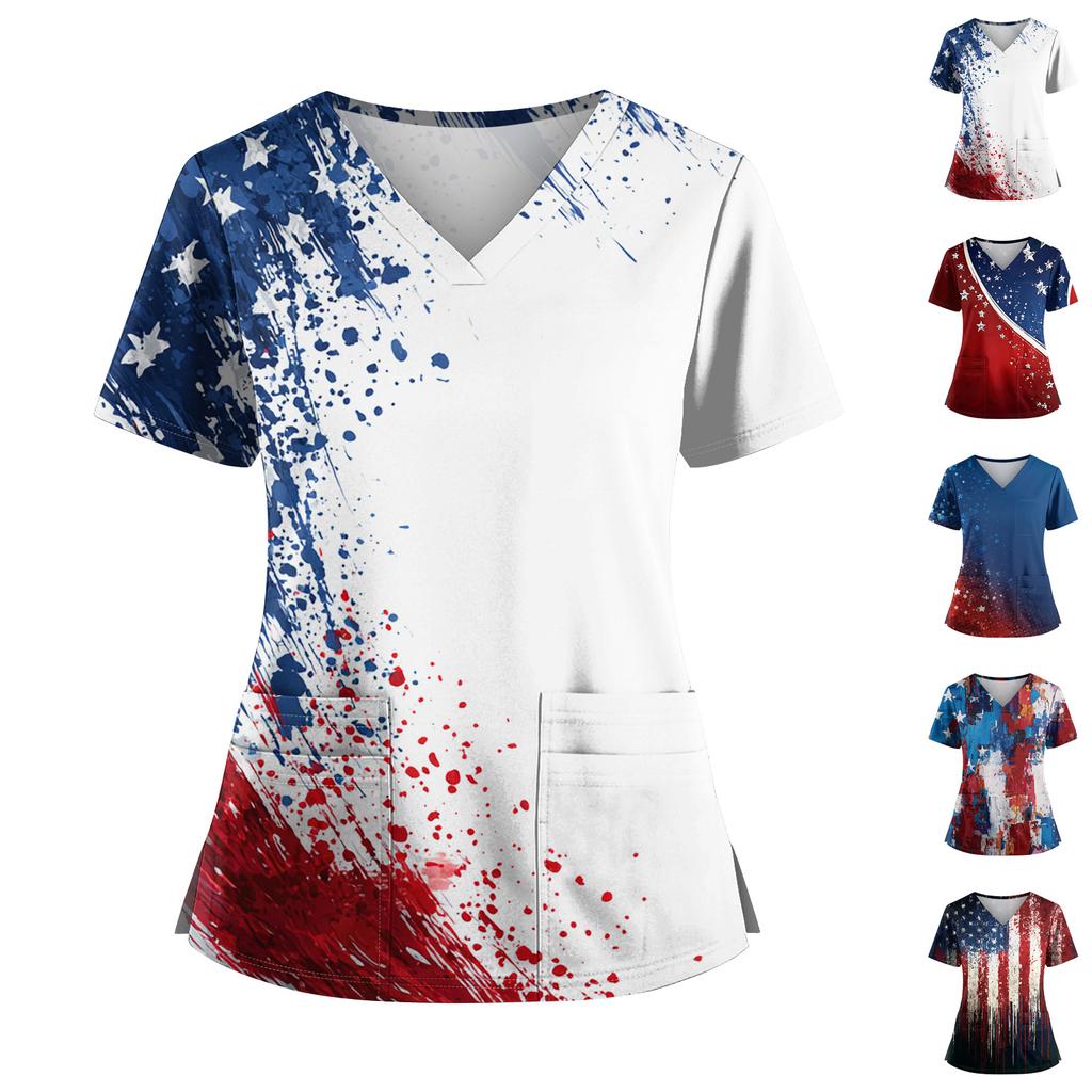 Women's Independence Day Print V-Neck Double Pocket Short Sleeve Uniform with Slit Hem - Caregiver Top