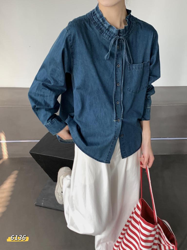 Spring Youth Denim Lace-Up Ruffle Collar Long Sleeve Shirt