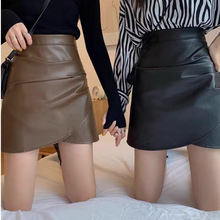 Women's Black Mini Leather Skirt: High-Waisted, Pleated A-Line, Plus Size, Anti-Exposure, Slimming Design for Spring and Autumn.