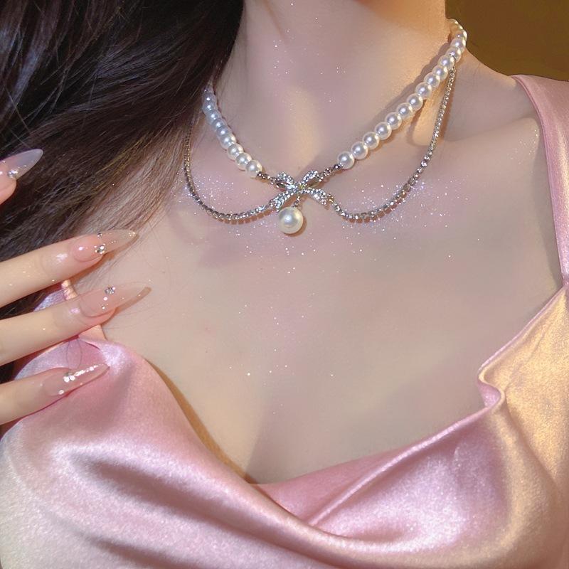 Belated romance~ flash diamond bow pearl necklace female design sense cold wind choker neck chain collarbone chain