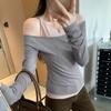 Embrace elegance with this Korean Style Slim-Fit Faux Two-Piece T-Shirt, designed specifically for women to wear during the autumn and winter seasons. Crafted from high-quality polyester, this shirt offers comfort and durability. Its chic color block pattern adds a stylish flair, while the long sleeves provide warmth and sophistication. This versatile top captures a modern, layered look with its faux two-piece design, making it a perfect addition to any wardrobe for a contemporary and fashionable appearance.