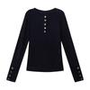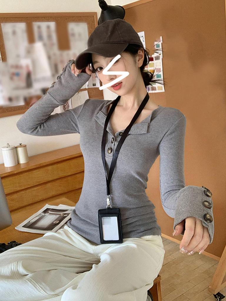 Spicy Girl Design V-Neck Button-Up Long-Sleeve Henley Top - Waist-Cinched, Slimming for Autumn/Winter