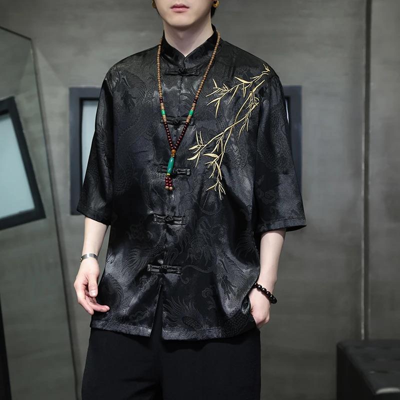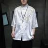 Summer Embroidery Shirt Men Ice Silk High Quality Casual Loose Short Sleeve Tops Retro Kung Fu Traditional Cardigan Mens