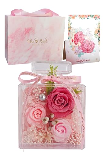 Perfume Bottle Flower Gift: This unique perfume bottle-shaped preserved flower gift ensures lasting beauty. This ultra-clear perfume bottle-shaped acrylic case features a variety of vibrant, voluminous, and everlasting flowers, including three 3-4cm roses, baby's breath, hydrangea, rice flowers, and leather fans. Unscented and requiring no watering, it's perfect for anyone who loves flowers but doesn't like strong fragrances. It makes a great gift or home decoration! It can be placed on a desk or other surface and enjoyed for a touching experience!