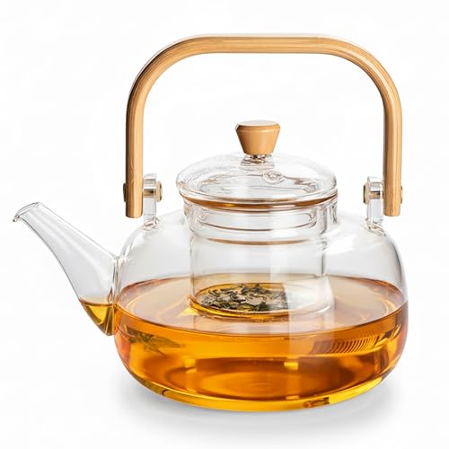 FGIUKC Heat-Resistant Glass Teapot, Large Capacity 1000ml, Serves 3-4 People, with Bamboo Handle, Transparent Glass Teapot, Perfect for Green Tea, Bla