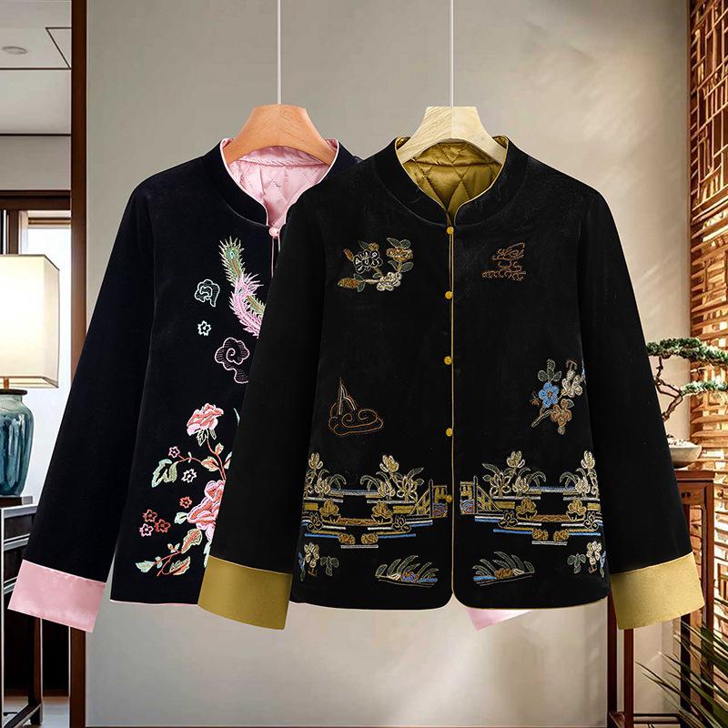 Introducing a stylish fusion of tradition and modernity, this jacket embodies the essence of retro Chinese fashion. Crafted with luxurious silk velvet, it features intricate embroidery that showcases exquisite craftsmanship. Perfect for the autumn and winter seasons, it provides the right amount of warmth with its medium outerwear thickness, enhanced by thickened cotton lining. The stand neckline adds a touch of elegance, making it a versatile piece for various occasions. Embrace comfort and style with this sophisticated outerwear.