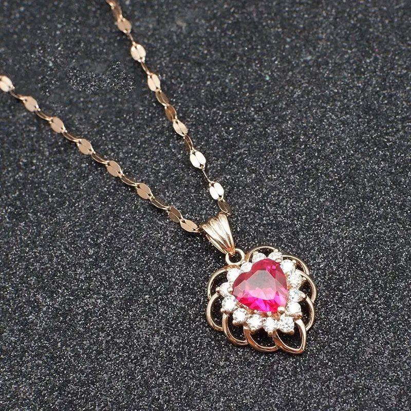 Exquisite Rose Gold Plated Russian Purple Gold Inlaid With Love Red Stone Pendant Fashion Temperament Colored Gold Necklace Collarbone Chain