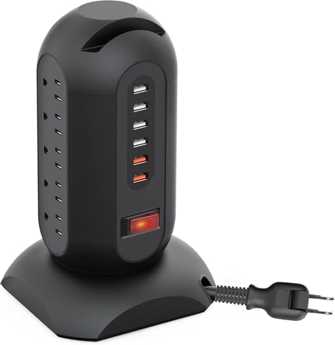 Novaoak Tower-Style Power Strip, 1500W, 3-Tier Vertical Outlets, 15 AC Outlets + 6 USB Ports, Retractable 3M Power Cord, Smartphone Holder, Grounding