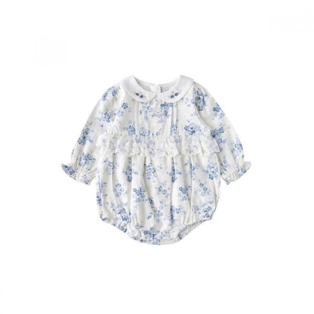 The Minkmew flower embroidery bodysuit is a bonnet set utilizing the signature flower design, featuring embroidered collar and frill details at the chest, boasting a romantic style. It's perfect as outerwear for newborns and infants.