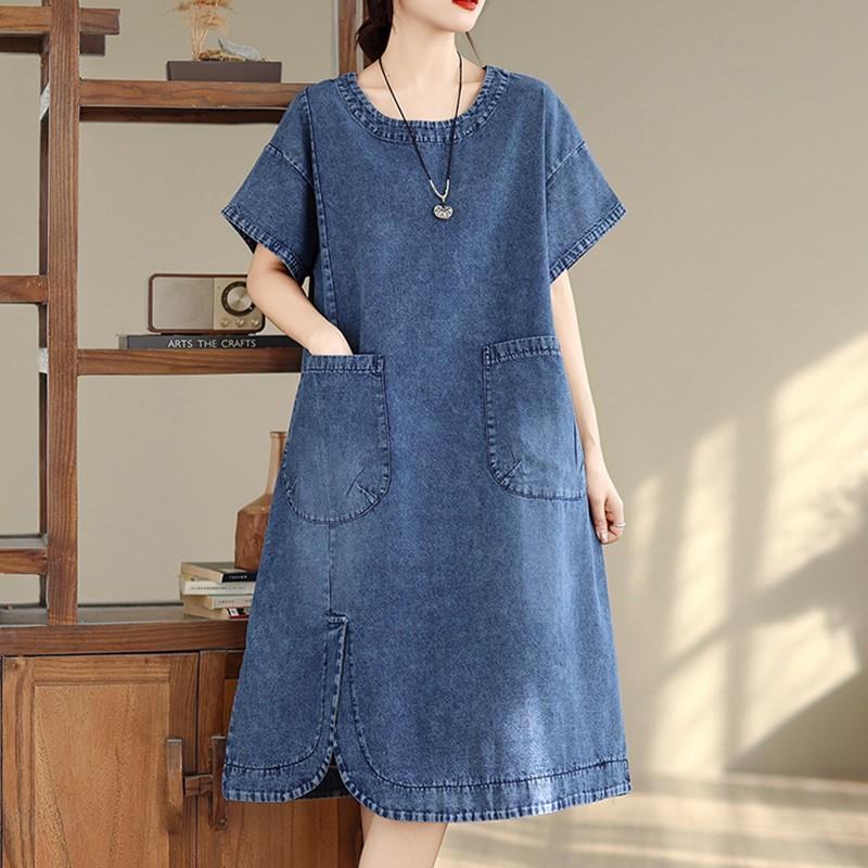 Short sleeve Plus size vintage new in dresses for women casual loose midi summer denim dress