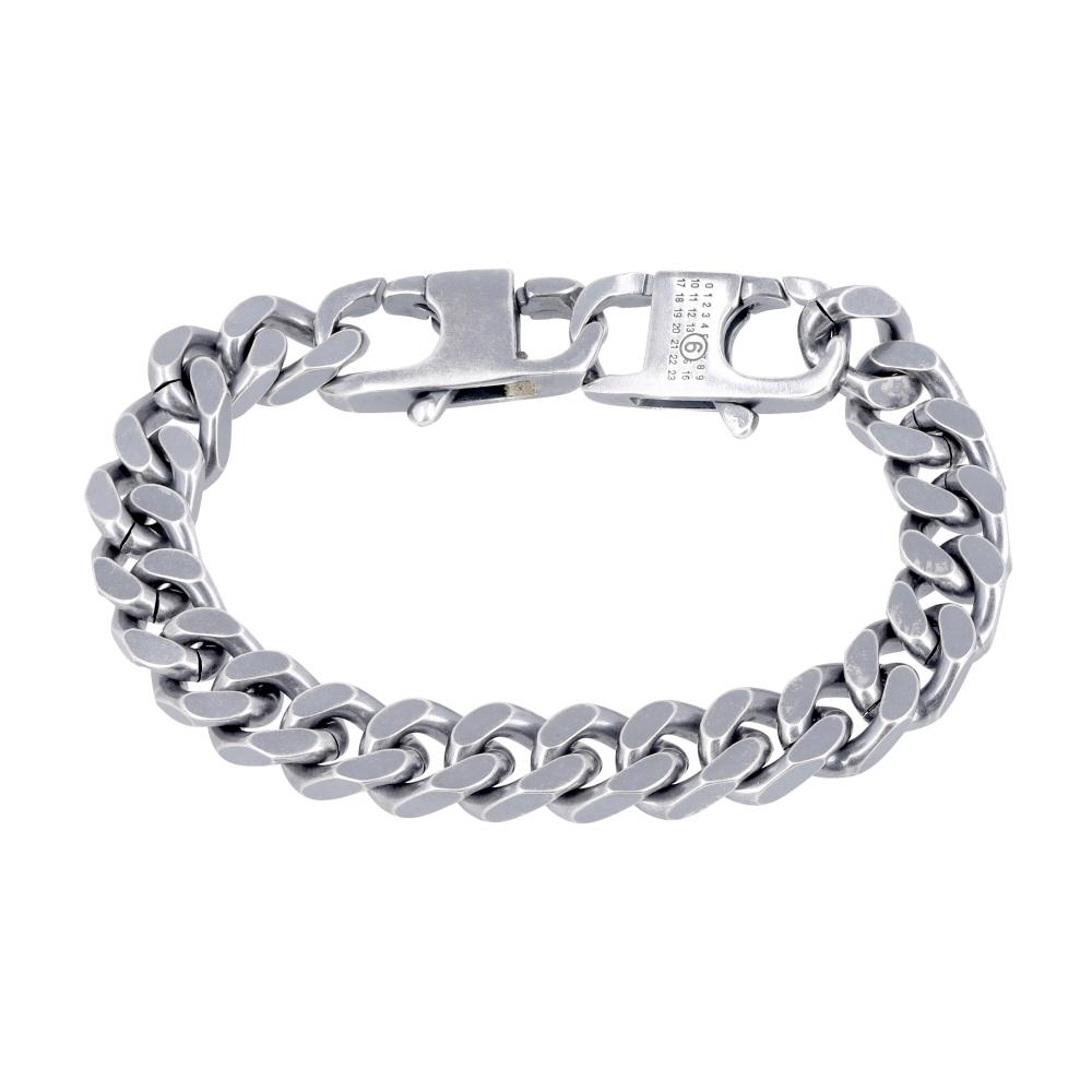 Το βραχιόλι αλυσίδα Maison Margiela SM6UY0110 P8884 954 MM6 με χαραγμένο αριθμημένο λογότυπο είναι ένα γυναικείο αξεσουάρ από τη μάρκα MM6 Maison Margiela, με σχέδιο αλυσίδας κατασκευασμένο από ορείχαλκο και παραγμένο στην Ιταλία.. Αυτό το βραχιόλι σε ασημί χρώμα χαρακτηρίζεται από τη δομή του με κρίκους και το χαραγμένο λογότυπο με αριθμούς, καθιστώντας το αρκετά ευέλικτο ώστε να ταιριάζει με διάφορα στυλ.