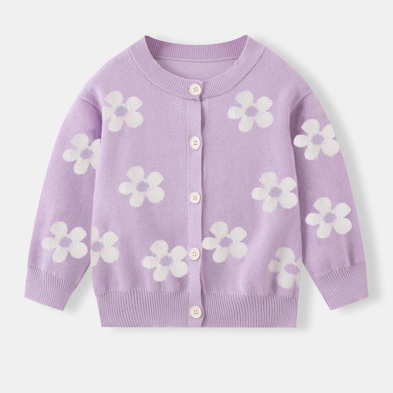 New Spring and Autumn Children's Cotton Thin Flower Sweater Coat for Girls and Baby with Round Neck Long Sleeve Knitted Cardigan