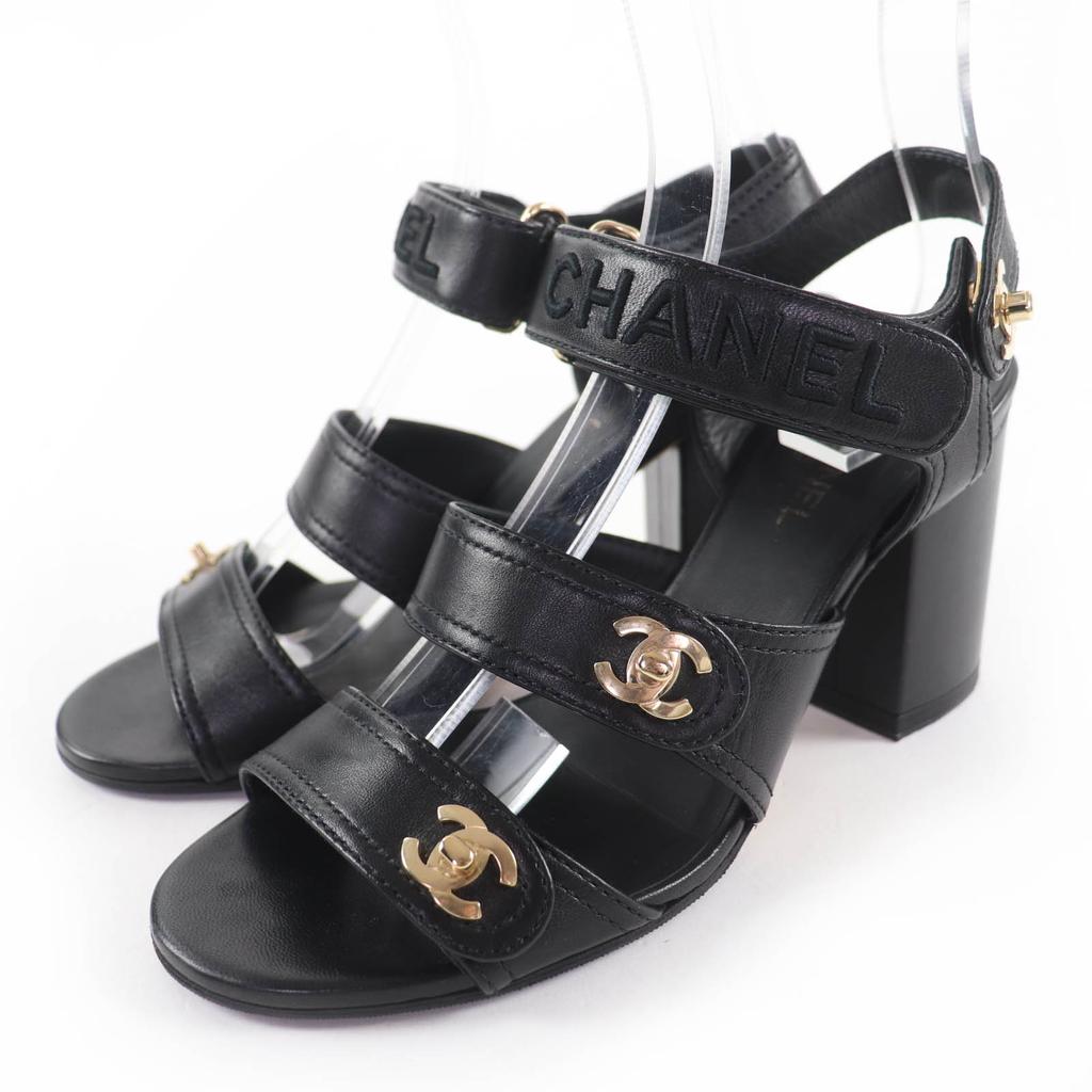 Great CHANEL Sandals COCO Mark Turn Lock Leather black leather Women 37 G37387 Used