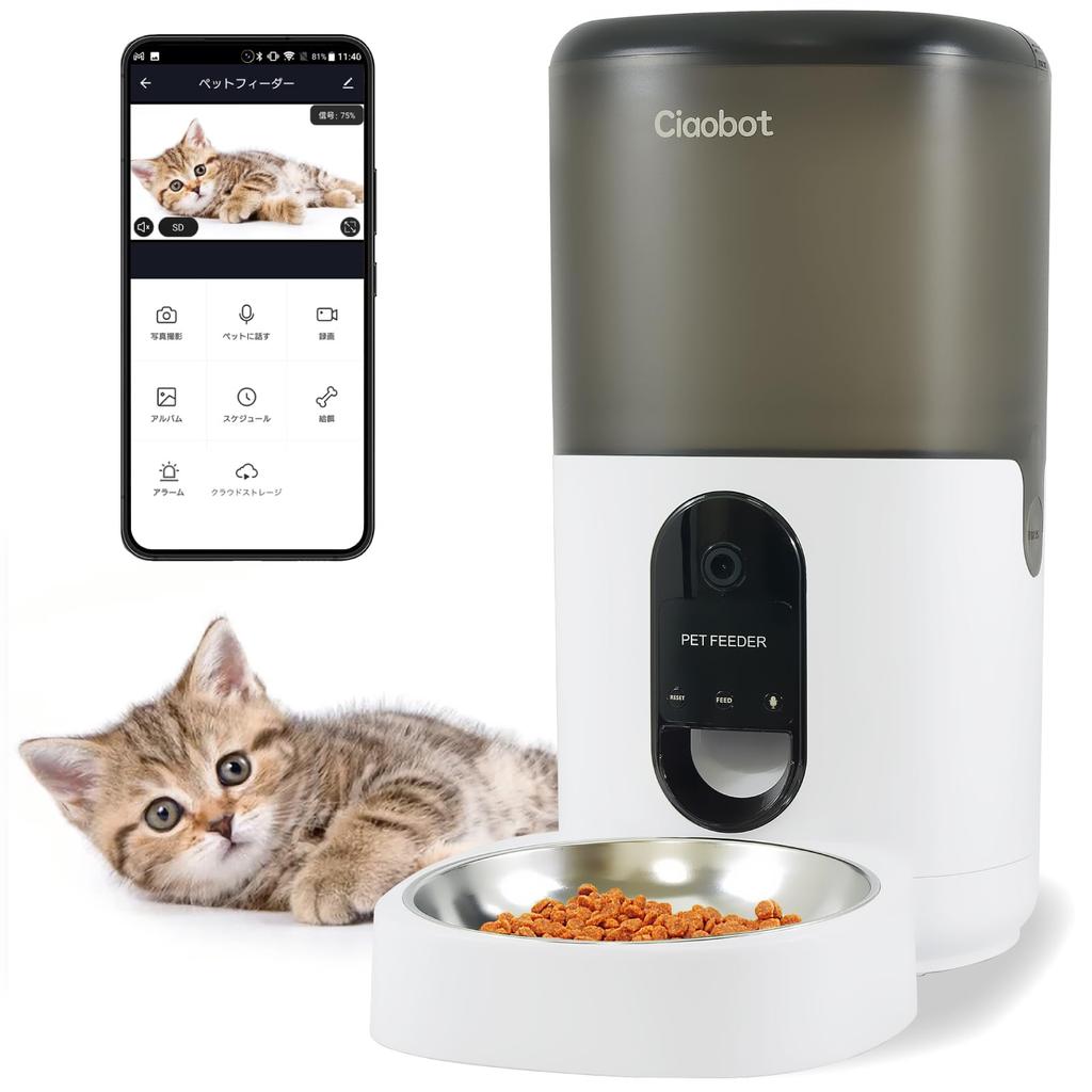 [Easy Feeding & Timer Settings via App] The Ciaobot automatic pet feeder can be used immediately by linking your smartphone to the device using the dedicated app. There are two feeding methods: timer setting via the app and manual feeding. With timer feeding, you can set up to 8 patterns for day of the week, time, frequency, and amount of food. You can freely set the amount to 10-200g (10g/1 step) for up to 8 feedings per day, according to your dog or cat's growth. The large 6L tank can store up to 60 days' worth of food. (*Calculated based on one 3.8kg cat)