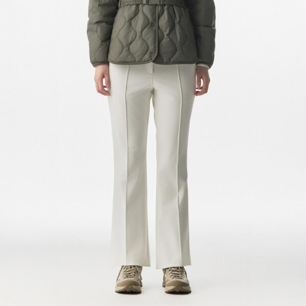 KOLON SPORT Women's Bootcut Pants TVPNS25432CRE are comfortable outdoor pants made from a blend of nylon and polyurethane. The silhouette is bootcut, and the fabric is highly elastic, making it suitable for summer activities. The color is Silver.
