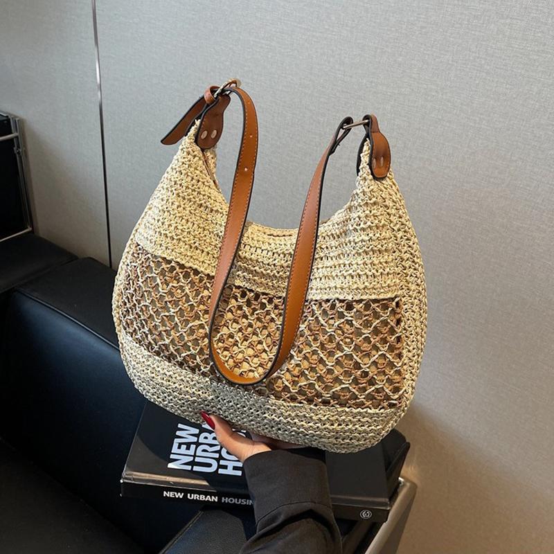 Women Hollow Shoulder Bag Large Capacity Straw Weaving Travel Handbag Adjustable Strap Shopper Tote Bag