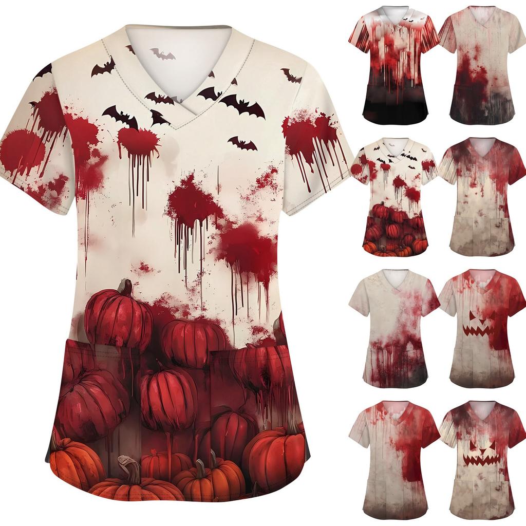 Γυναικεία Μόδα V-λαιμόκοψη Κοντομάνικη Επαγγελματική Ενδυμασία Με Τσέπες Τοπ με Αποκριάτικη Εκτύπωση