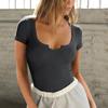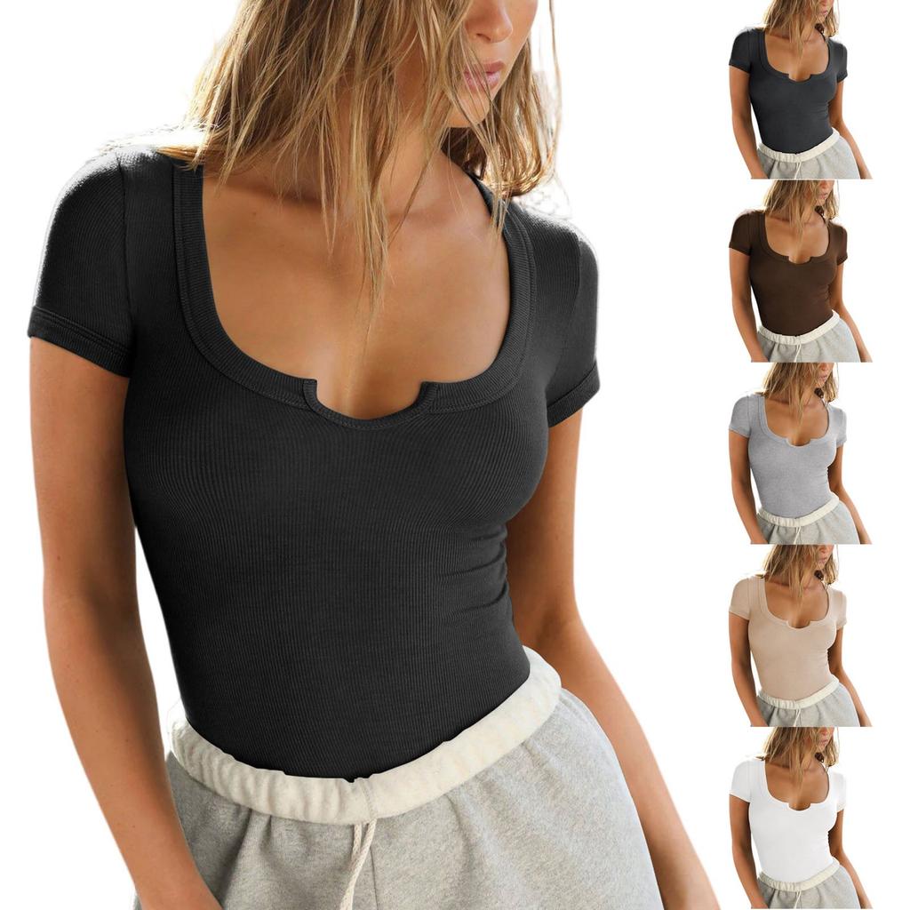 Women's Short Sleeves Ribbed Fitted Shirt Basic Notch Scoop V Neck Slim T Shirt Tops