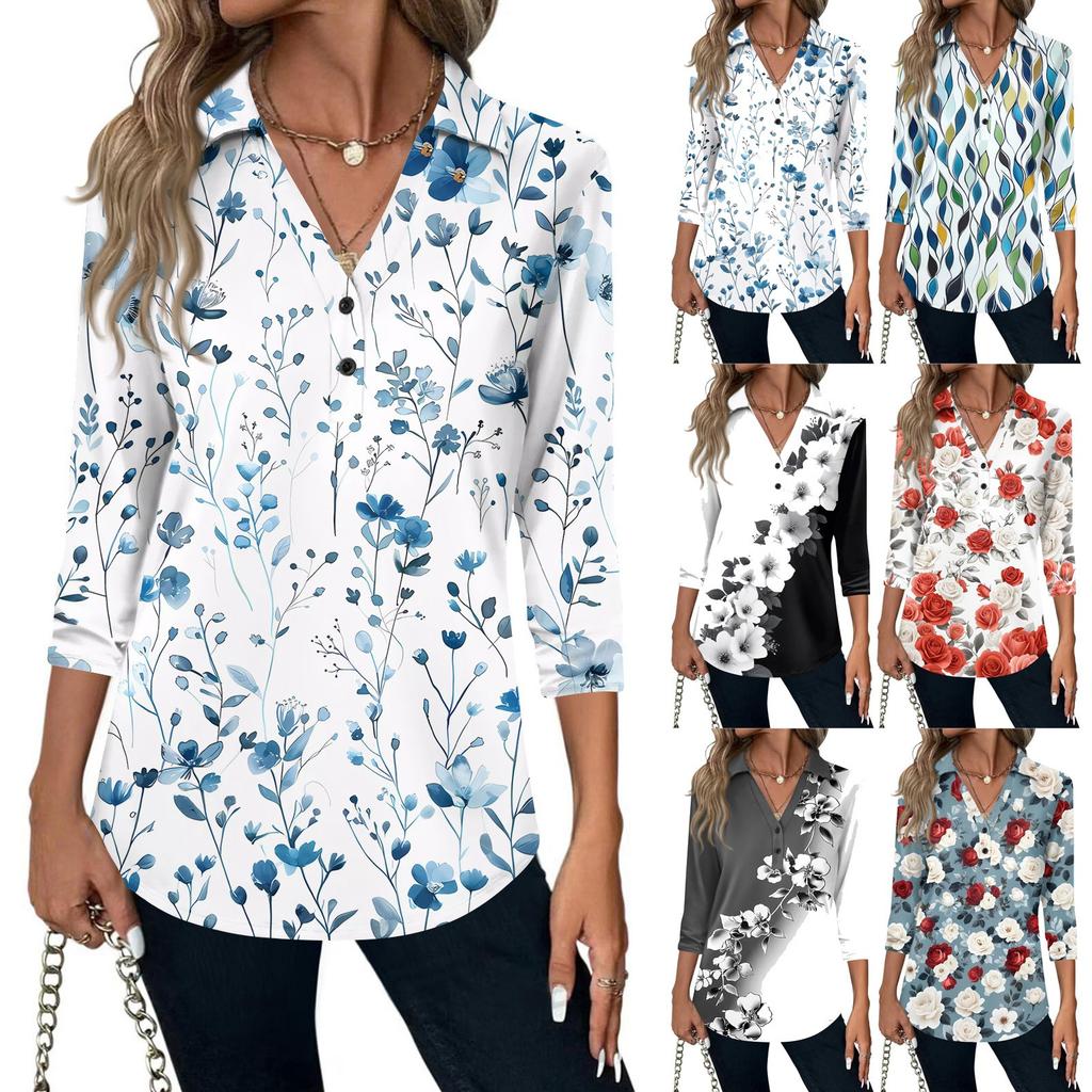 Women's Fashion Casual Lapel Short 3/4 Sleeve Print Shirt Women's V-Neck Button Tops