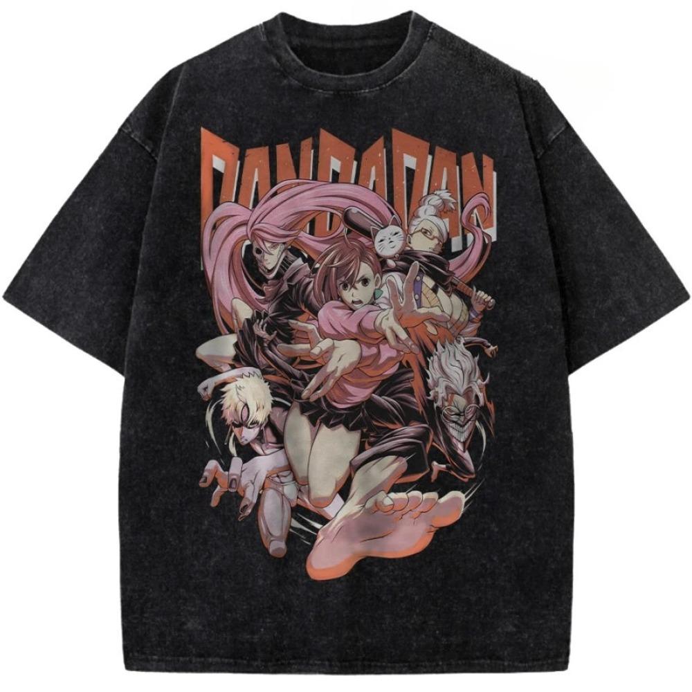 Dandadan Main Characters & Supernatural Forms Vintage Washed Anime T-Shirt, Unisex Manga Fan Streetwear Tee, 100% Cotton Casual Short Sleeve Top