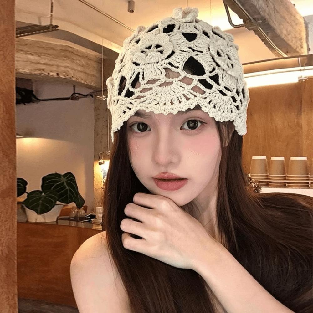 Bohemian Style Hollowed Out Beanie Cap Handmade Woven Cap Retro Crochet Flower Knitted Hat Outdoor