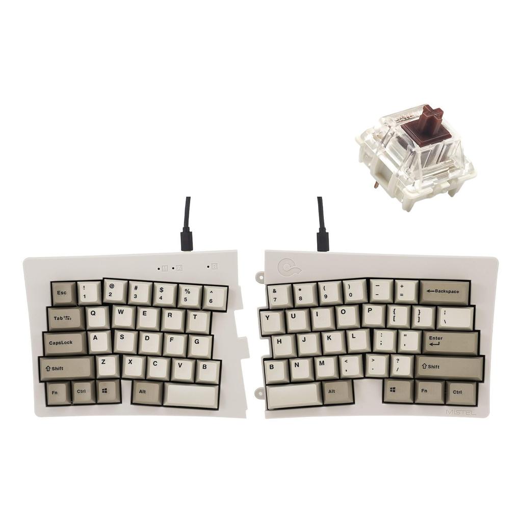 Package contents: 1 x Keyboard, 1 x USB cable (Type-A to C), 1 x USB cable (Type-C to C / coiled cable for connecting left and right units), 1 x Mistel key puller (keycap removal tool), 6 x magnetic rubber feet, 2 x left and right connecting screws