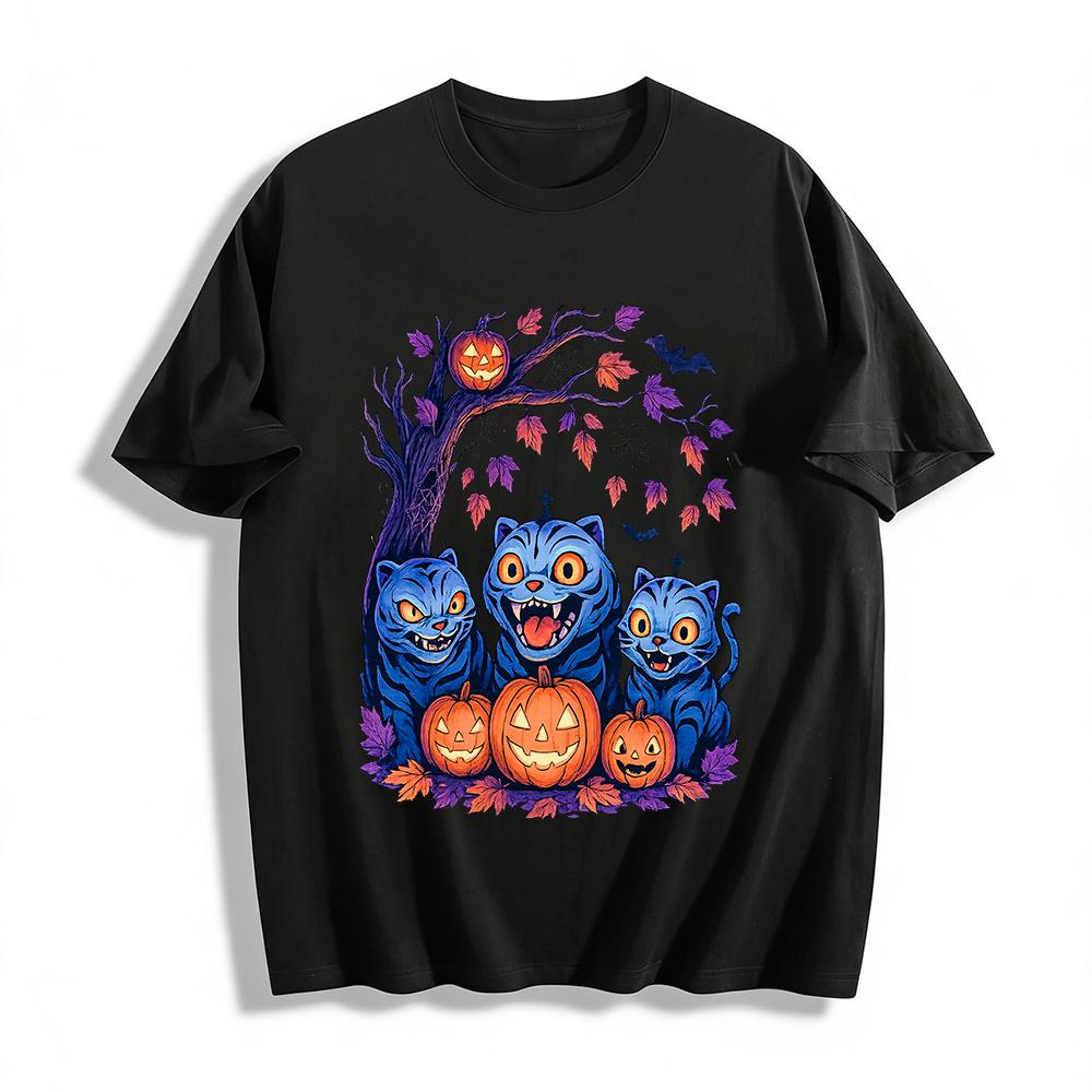 Halloween Spooky Blue Cat Pumpkin Print Top Casual Crew Neck Long Sleeve Tee For Men Women Pure cotton T-shirt