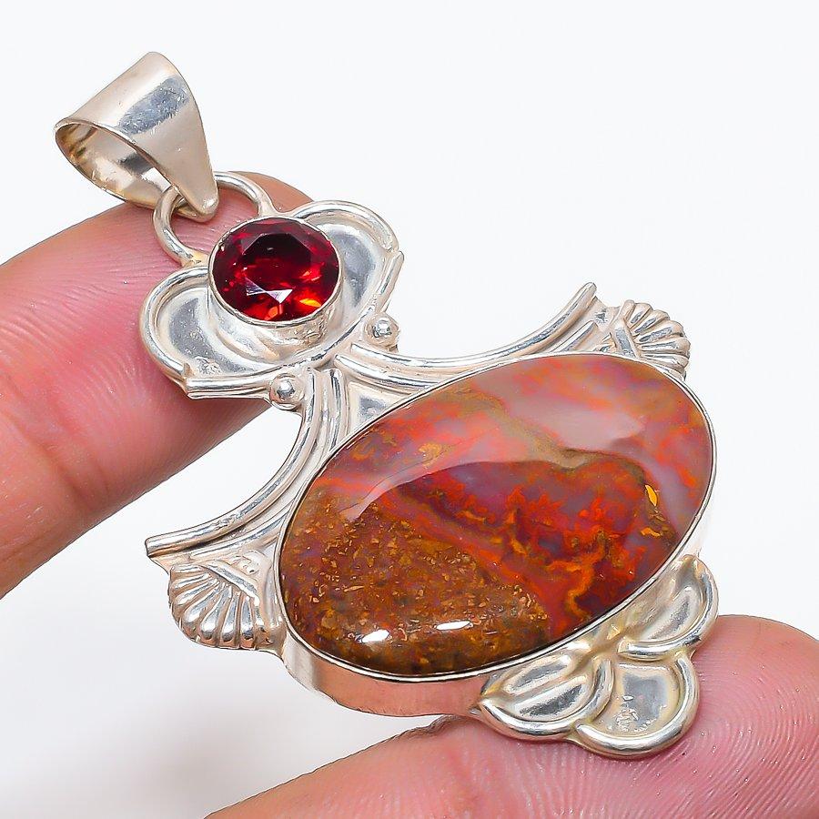 Natural Seam Agate, Garnet Gemstone 925 Sterling Silver Pendant 2.36" AP-14269