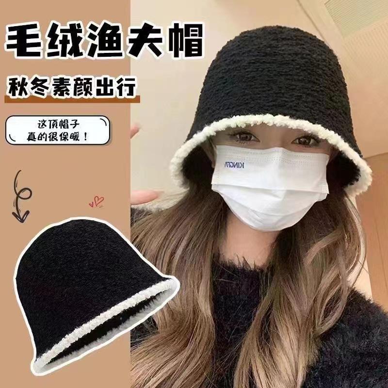 Xiaoxiangfeng plush bucket hat female face small plain knitted bucket hat big head circumference hat