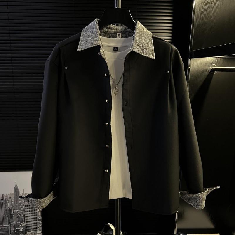 Men's Contrast Color Collar Long Sleeve Shirt Black Casual Loose Button Down Shirt Fashion Streetwear Top