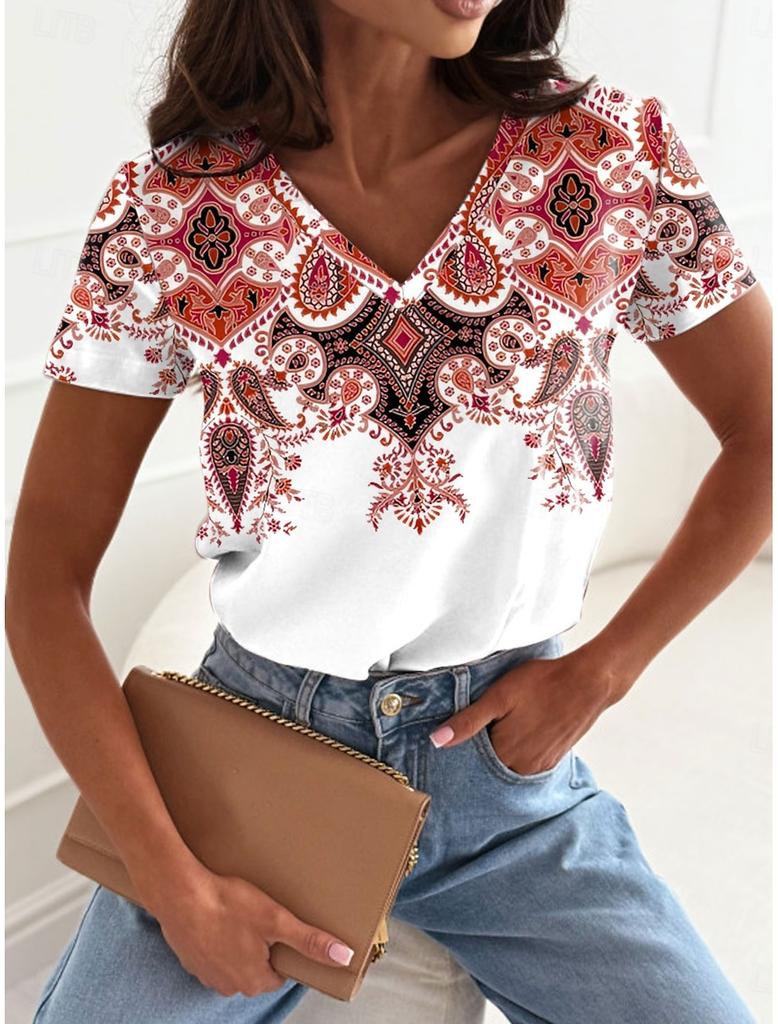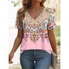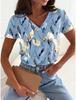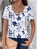 Women's fashionable printed T-shirt with floral pattern, casual short-sleeved V-neck, regular top, everyday printed T-shirt, casual blouse