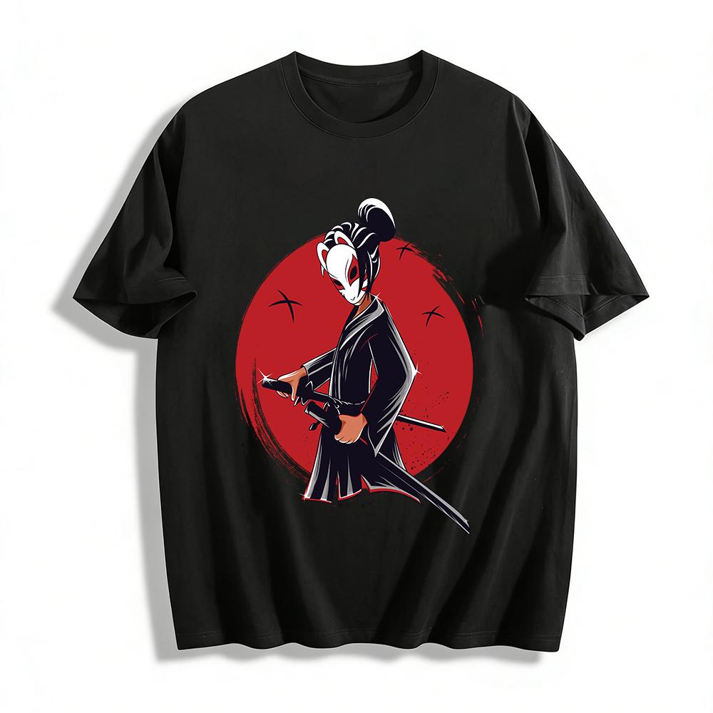 Japanese Fox Mask Samurai Print Trendy T-Shirt Retro Dark Style Top Pure cotton T-shirt