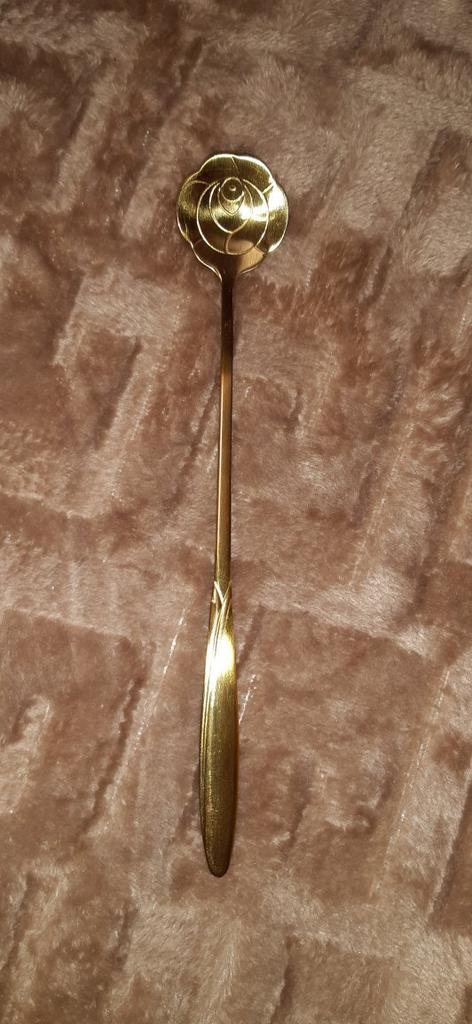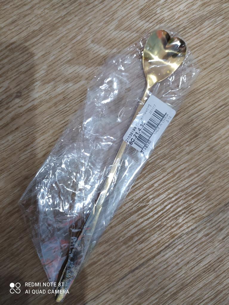It is a long heart-shaped spoon in gold color. The spoon arrived well packed and in perfect condition. Aesthetically it is very beautiful and I love the heart shape! The fact that it is long is a very comfortable look because I can mix anything well especially with the tall cups that I like. Now I often use it for both breakfast and snack. The price is great and the product is also recommended!