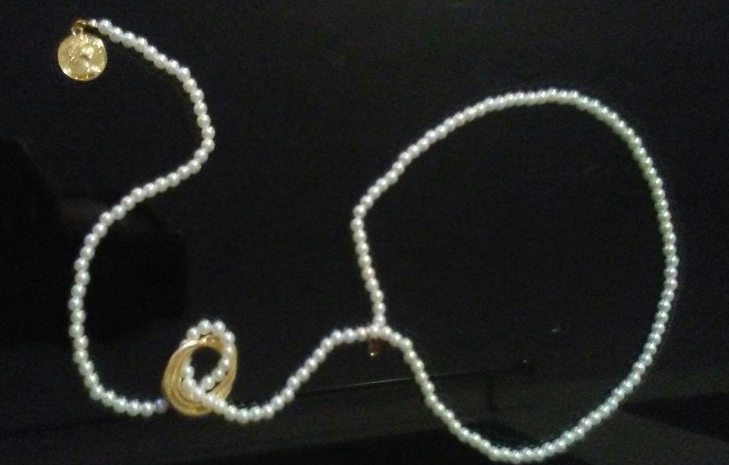 does not correspond to the photo, on the model the pearls are yellow, through the knot and lie flat. a pathetic fake arrived.