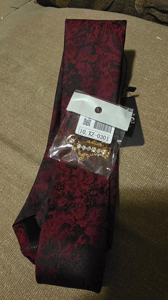 A gorgeous set: a tie, a handkerchief, cufflinks and a pin. In my opinion, a cheap pin, with bright red glass, will make the set complete. I put it on another item. Many thanks to everyone. I recommend buying it.