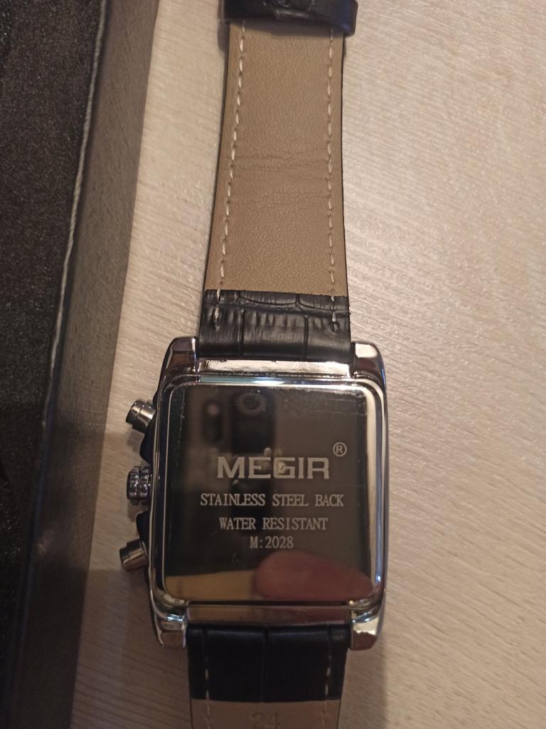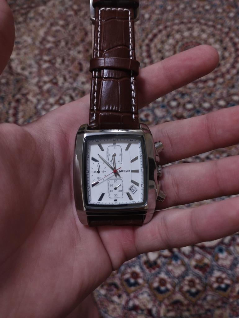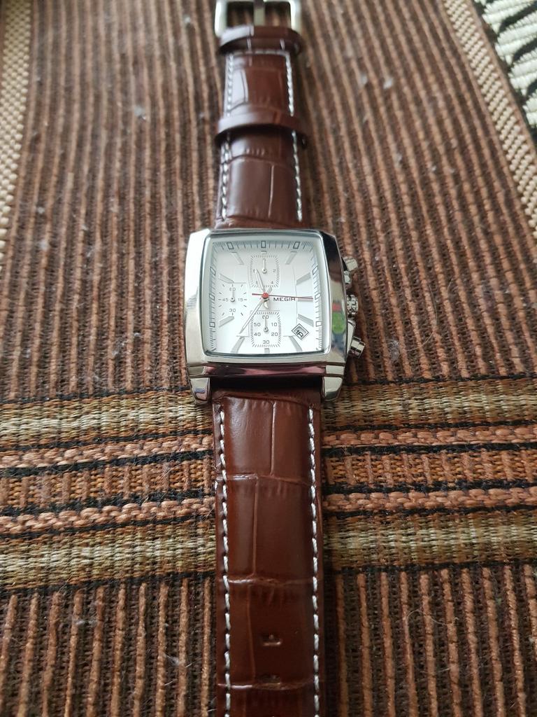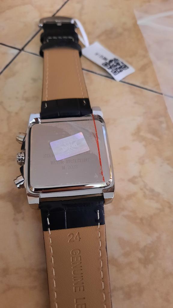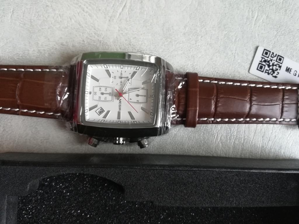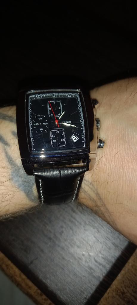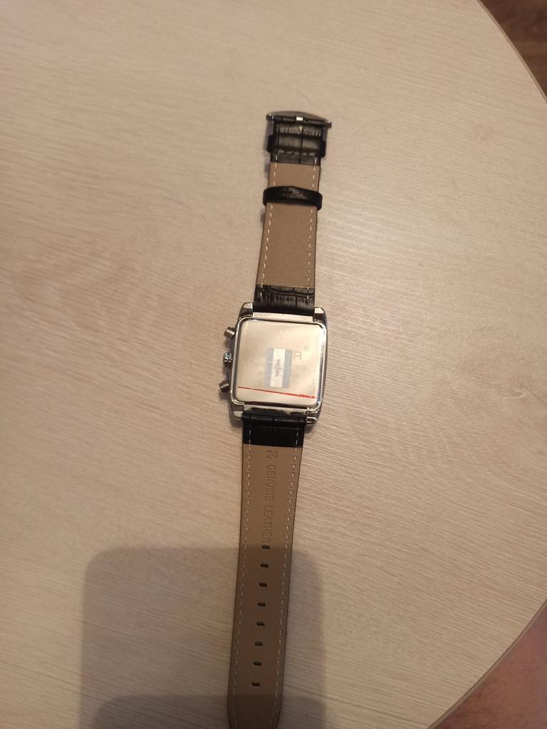A very beautiful and qualitative watch. I am very happy with the product, it looks pretty good. As it says on the bracelet it is genuine leather and I hope it will last quite a while. It's not quite as big as it looks in the picture, but it fits very well in the hand.