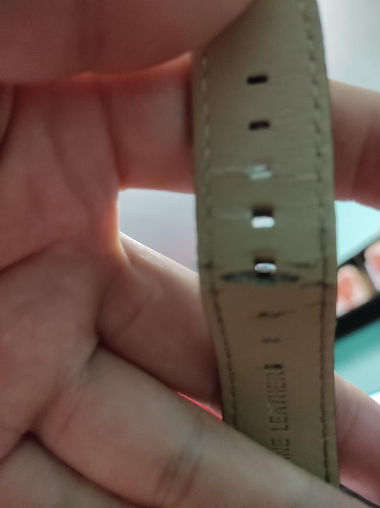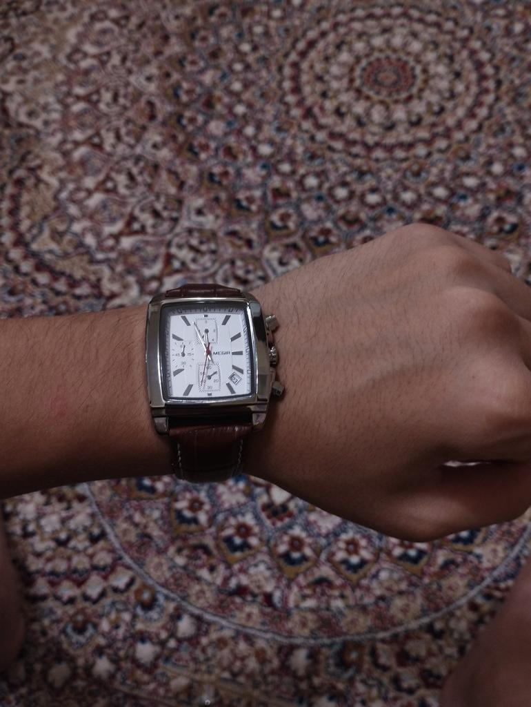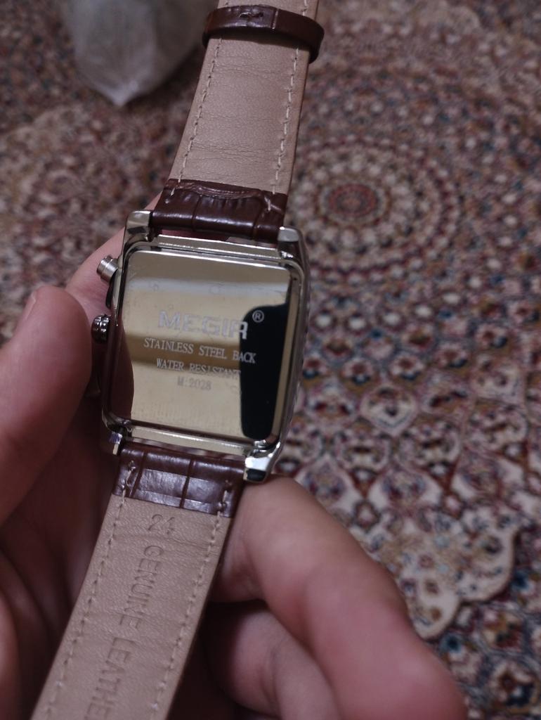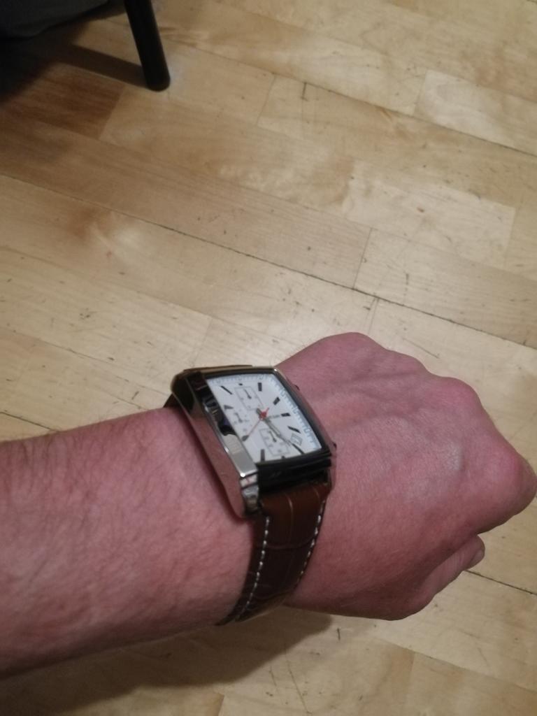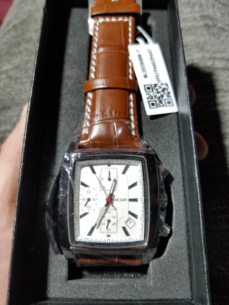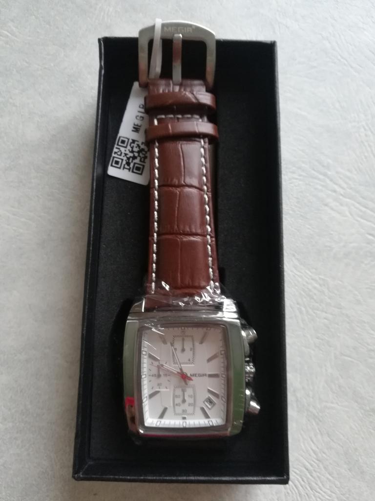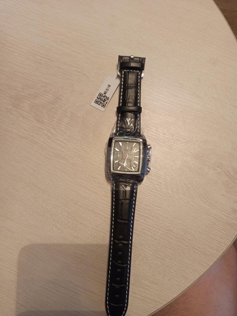 A very beautiful and qualitative watch. I am very happy with the product, it looks pretty good. As it says on the bracelet it is genuine leather and I hope it will last quite a while. It's not quite as big as it looks in the picture, but it fits very well in the hand.