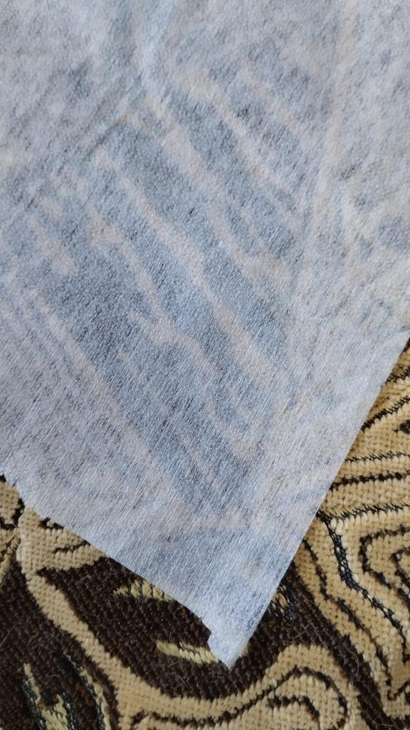 Grayish color. One edge is torn unevenly. Question: how will it stick to the fabric.
