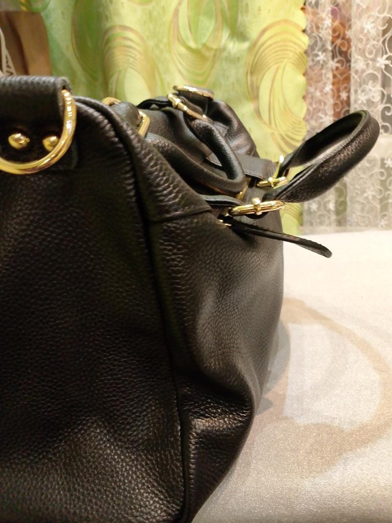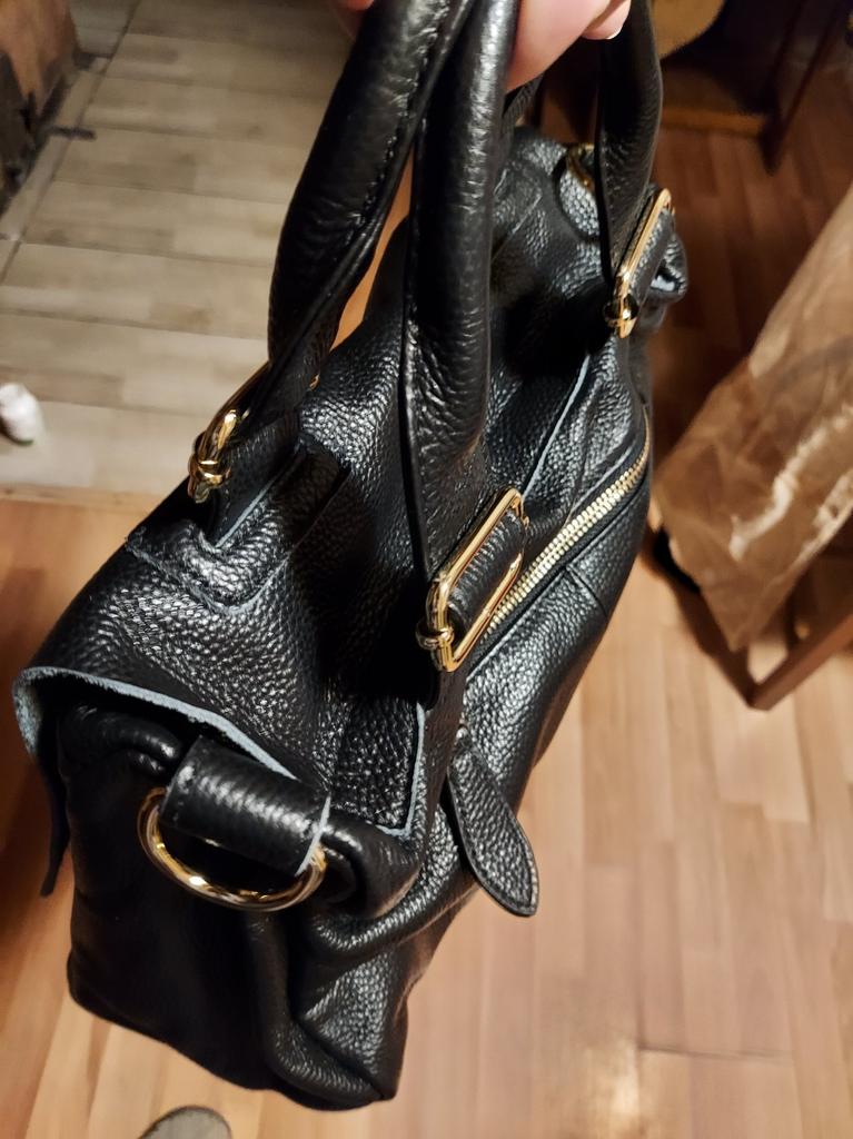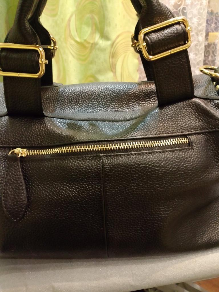 The bag is not bad, I removed the shiny metal parts right away, it looks better that way. It smells of natural leather and paint, I put two two-liter bottles of water inside and paper so that it hangs down and takes the desired shape. I'm waiting!