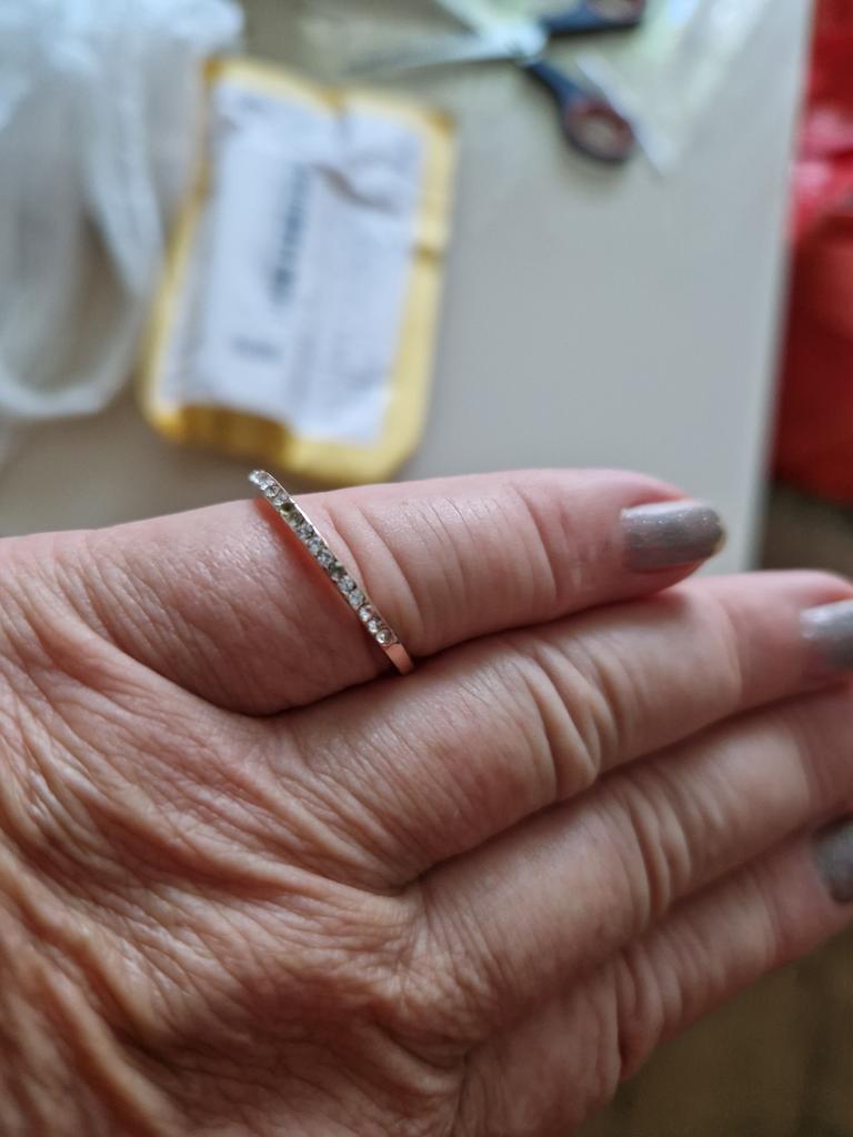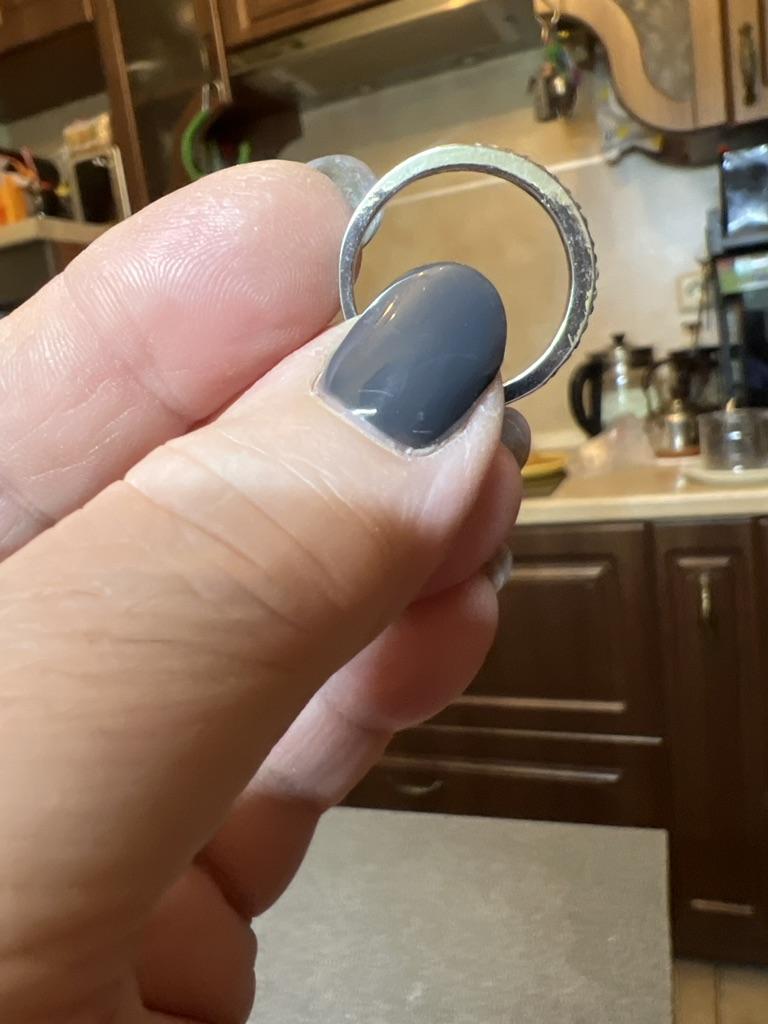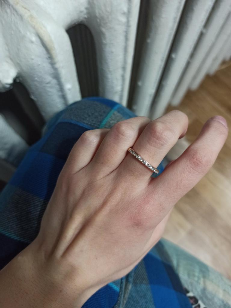The goods arrived on time. The ring is beautiful. Very petite and delicate. All the stones are in place. But they are not on the entire perimeter of the ring, but only on one side. I liked. The size is suitable. I chose according to the table. Corresponds to our √17. Time will tell how it will wear.