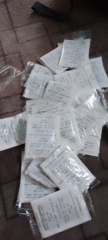 The contents of the bags are knocked down and cemented (damp and solidified?). It seems like each pair is packed in cellophane, but apparently something went wrong. It is not clear whether it is possible to extract benefit from a petrified lump of herbs.