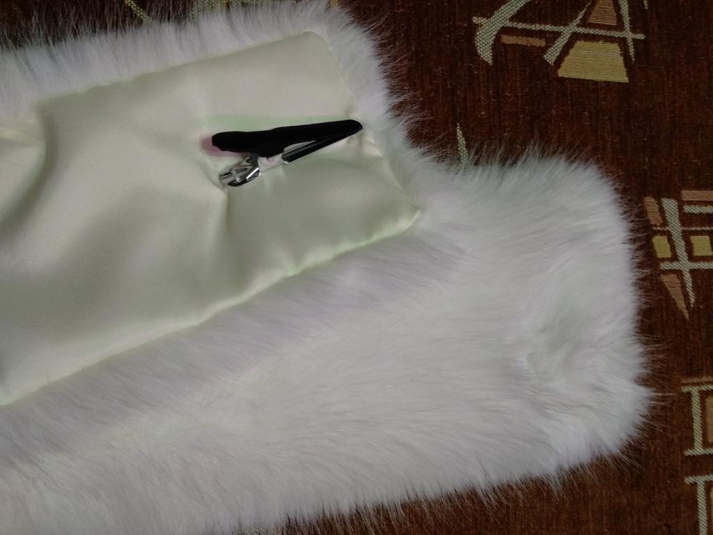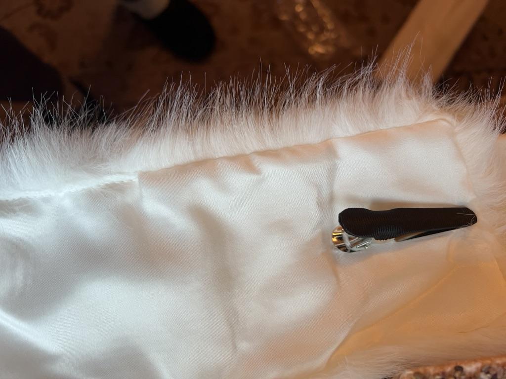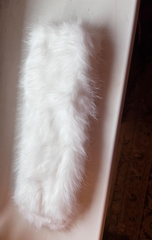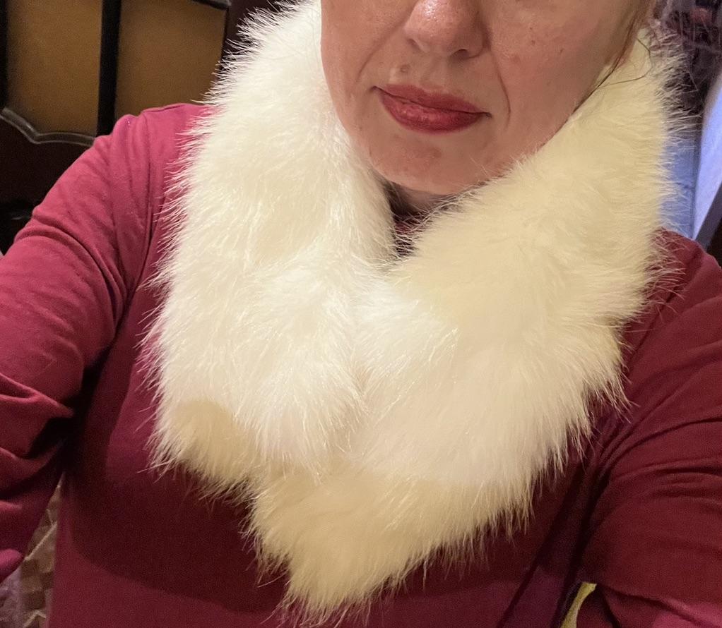 A cute white fluffy scarf with a clip, looks like real fur, but doesn't look like the promo photo, short, only on the neck, not to the chest