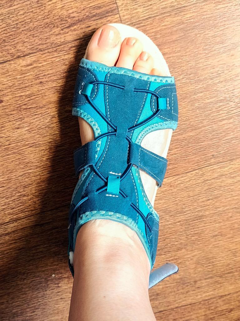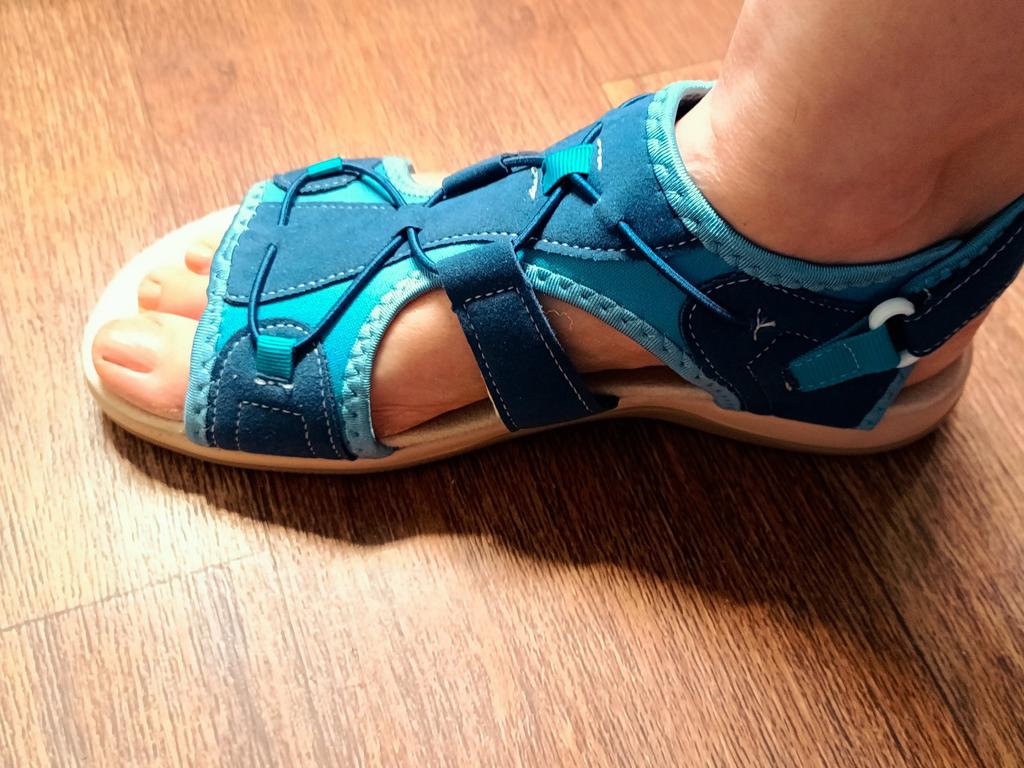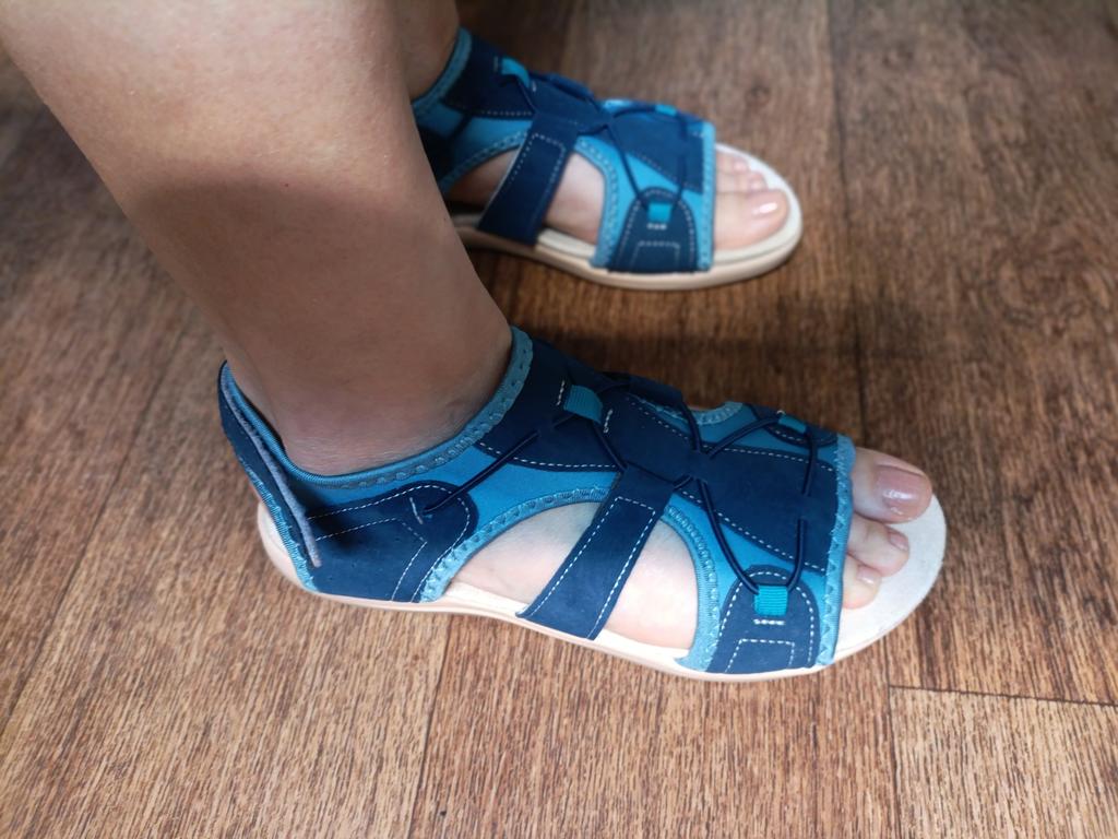 Comfortable soft sandals. I took one size larger so that the heel wouldn't hang over.